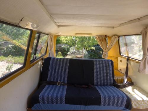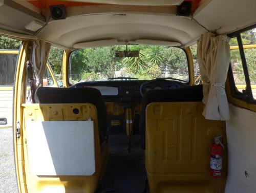 This vehicle was built in Australia in 1972 and is an original part camper conversion. That means it has a pop top roof and a back seat that folds into a bed, with an additional bed sleeping two more up top. It has a 1600cc engine.