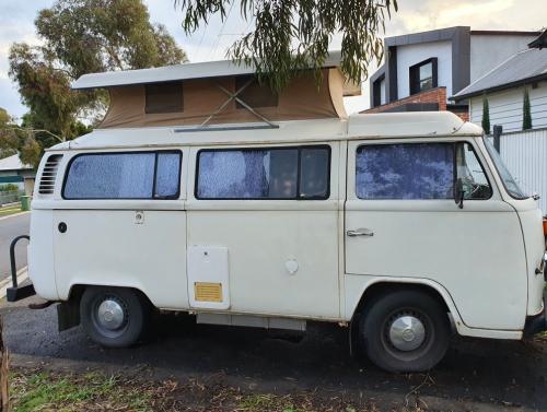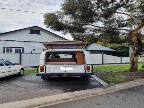 It has an awesome (and super comfortable) rock n roll bed, heaps of cupboard space, canvas shade (as pictured) a working sink and modern stereo system.