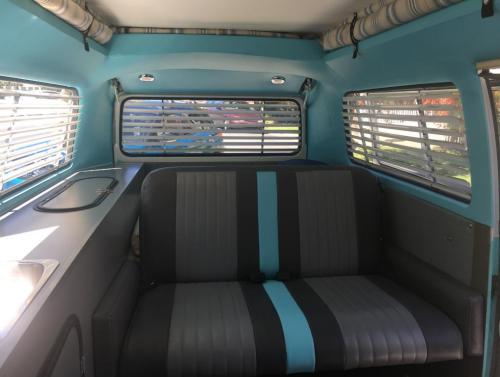 It has a rock and roll bed (which can comfortably sleep 2 adults), plenty of storage space, functioning sink and water tank, window louvers in 3 rear windows and also window shields for all windows providing privacy whilst you sleep. Also has white walled tyres.