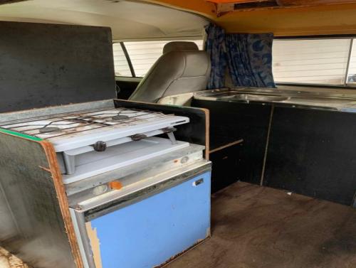 Has the original bed, stove, fridge and sink; although the interior wood panelling as has been changed.