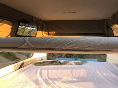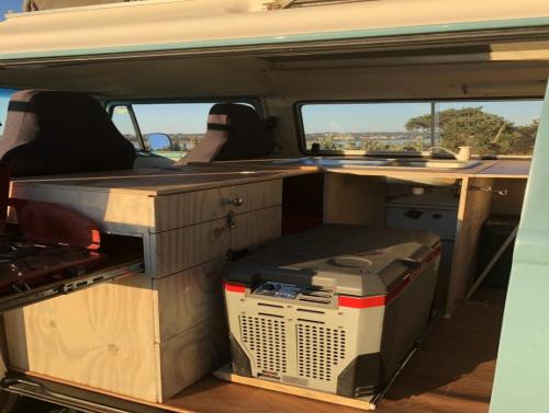 Custom ply kitchen fit out for maximal storage and in/out cooking, storage in 6 removable bucket drawers, large cupboard face doubles as an external table, sink with hand pump and drainage, Engel compressor fridge on slides for access when cooking outside van, Gas bottle (with ext storage compartment) and burner, custom fitted awning set, table and chairs, fitted split battery system and solar panel charger, 240V hook up and cables, rock n roll queen bed, mezzanine floor and mattresses, full set of curtains, tow bar and 4 bike rack.