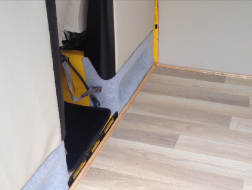 The rear floor pan has been finished with a timber laminate that matches the door cards.